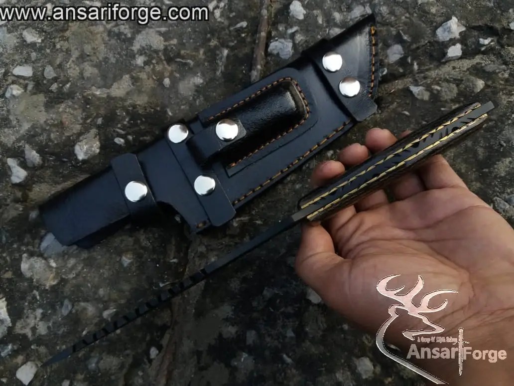 The Ansari Forge Bowie Knife features a hand-forged Damascus steel blade with a twisted pattern, stag antler handle, and full tang construction. Includes a handmade leather sheath. Perfect for outdoor adventures, hunting, or as a collector’s piece. Durable, elegant, and built to last.